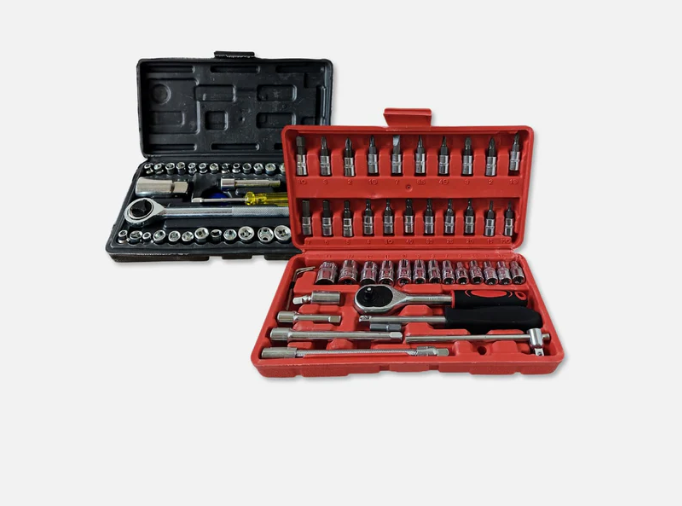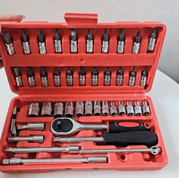 - El Kit incluye: Dados, extensiones, adaptador articulado, chicharra, destornilladores, Torx, Allen.